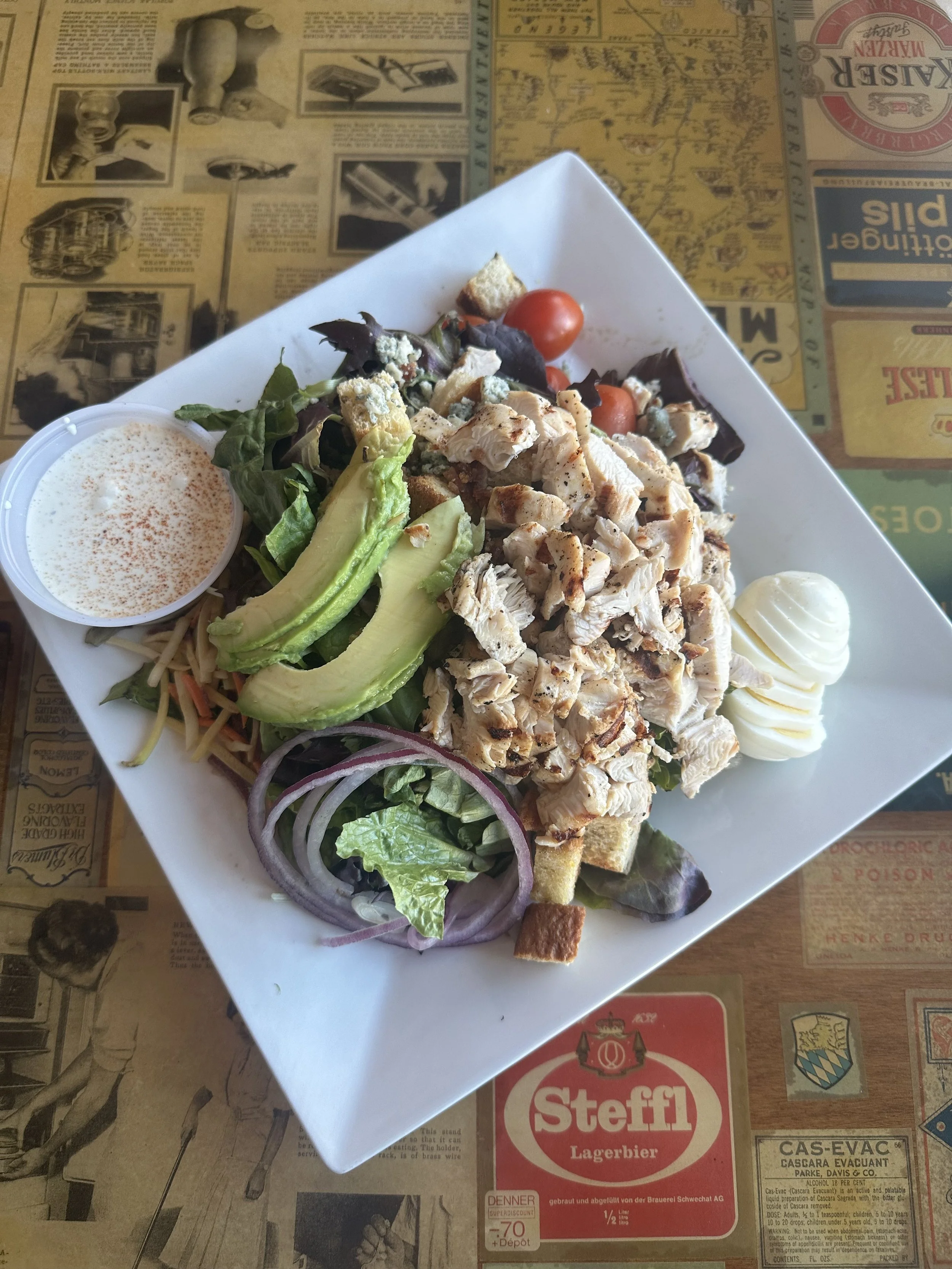 We’ve had our fair share of Cobb salads over the years, and this one stands out. The chicken is cooked fresh and served hot over crisp, cold greens. The ranch is made in-house. It’s delicious!